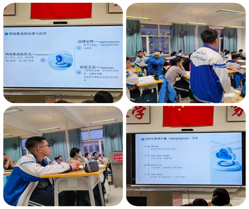 市公安局干警们为此精心备课,围绕高中生学习生活场景,用中英双语深度剖析了“AI换脸诈骗”、“游戏代练陷阱”、“虚假测评链接”等真实案例,将抽象的术语变成了可知可感的警示。